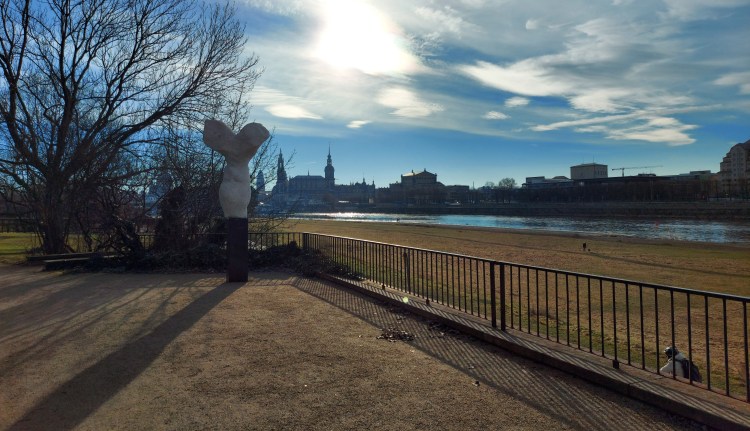 Wir erreichen den Altmarkt mit der Kreuzkirche und dem Kulturpalast, dann gehen wir zum Schloss und gelangen durch das Georgentor zum Fürstenzug und von dort aus zur Frauenkirche. Wir schlendern die Brühlschen Terrassen entlang, ehe wir nahe der neuerbauten Synagoge hinter zur Elbe laufen, die uns von nun an begleiten wird.